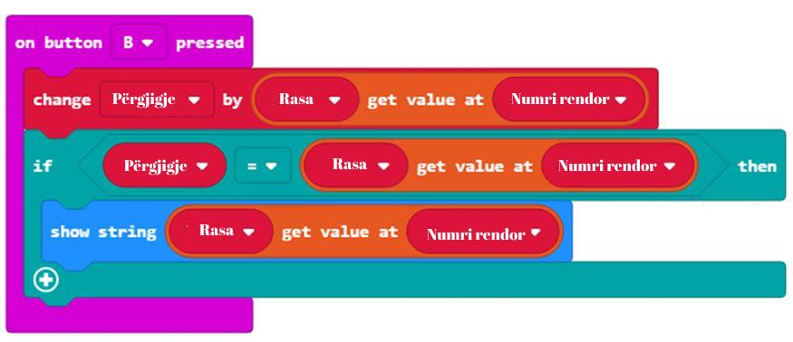 Pasi të klkoni butonin B në Micro:bit do të paraqitet trajta e rasës e cila i përgjigjet pyetjes së dhënë dhe ajo do të paraqitet në ekran.