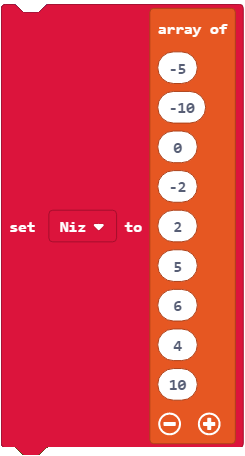 Për secilën monedhë në koleksion nevojitet hapësirë e veçantë për ruajtje, si dhe adresa unike (0, 1, 2,…) që më vonë të kemi mundësi të gjejmë metelikun e dëshiruar. Pasi programet tona MakeCode shtresëzohen çdo herë e më shumë dhe kërkojnë më shumë variabla për të ndjekur gjëra të caktuara, në vend të variablave që kemi mësuar deri tani do të na duhet të gjejmë mënyra të tjera për ruajtjen dhe organizimin e të dhënave tona. Situatat në të cilat duhet të ruhet një numër më i madh të dhënash janë shumë të shpeshta në punën e çdo programuesi. Ato kërkojnë përdorimin e një lloji tjetër variablash - duhet të përdoret vargu. Për këtë, në MakeCode, mund të shfrytëzojmë bllokun niz.