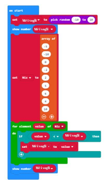 Të menduarit për problemin: Numri që del me përzgjedhje të rastësishme nga intervali nga -10 deri 10 duhet të krahasohet me secilin element të vargut të numrave -5, -10, 0, -2, 2, 5, 6, 4, 10. Nëse, për shembull, numri i gjeneruar është -1, vlera më e vogël nga ky është -10.