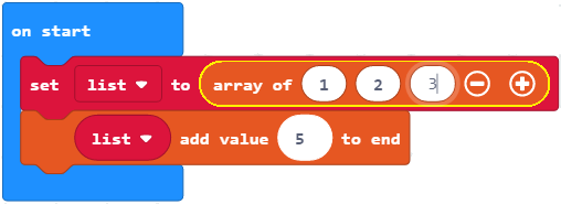 Krijoni disa elemente 1, 2, 3. Pastaj, në vargun tashmë të krijuar, shtoni numrin 5 në fund të vargut. Ndihmë e vogël: përdorni bllokun blok6.