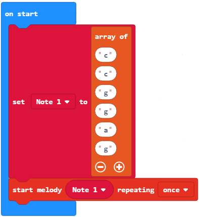 Përveç vlerave numerike, vargjet mund të përdoren edhe për ruajtjen e notave në formën e vargut. Nota paraqitet me oktavë dhe me gjatësi. Forma e një note është: C:2. Kjo nënkupton se dëgjohet nota C për 2 rrahje ritmi. Pauza mund të paraqitet në formën R:1, ku R nënkupton pushim dhe 1 - pushim për një rrahje ritmi. Pushimi është koha gjatë së cilës nuk ka tinguj. Përcaktojmë vargun e Notës 1 për të paraqitur 5 notat e para të melodisë Тwinkle twinkle little star: