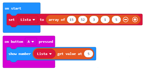 Lista pastaj mund të plotësohet me pesë numra, të indeksuar nga 0 deri 4. Elementet shtohen pas klikimit mbi shenjën “+” dhe futjen e vlerës në hapësirën e duhur.